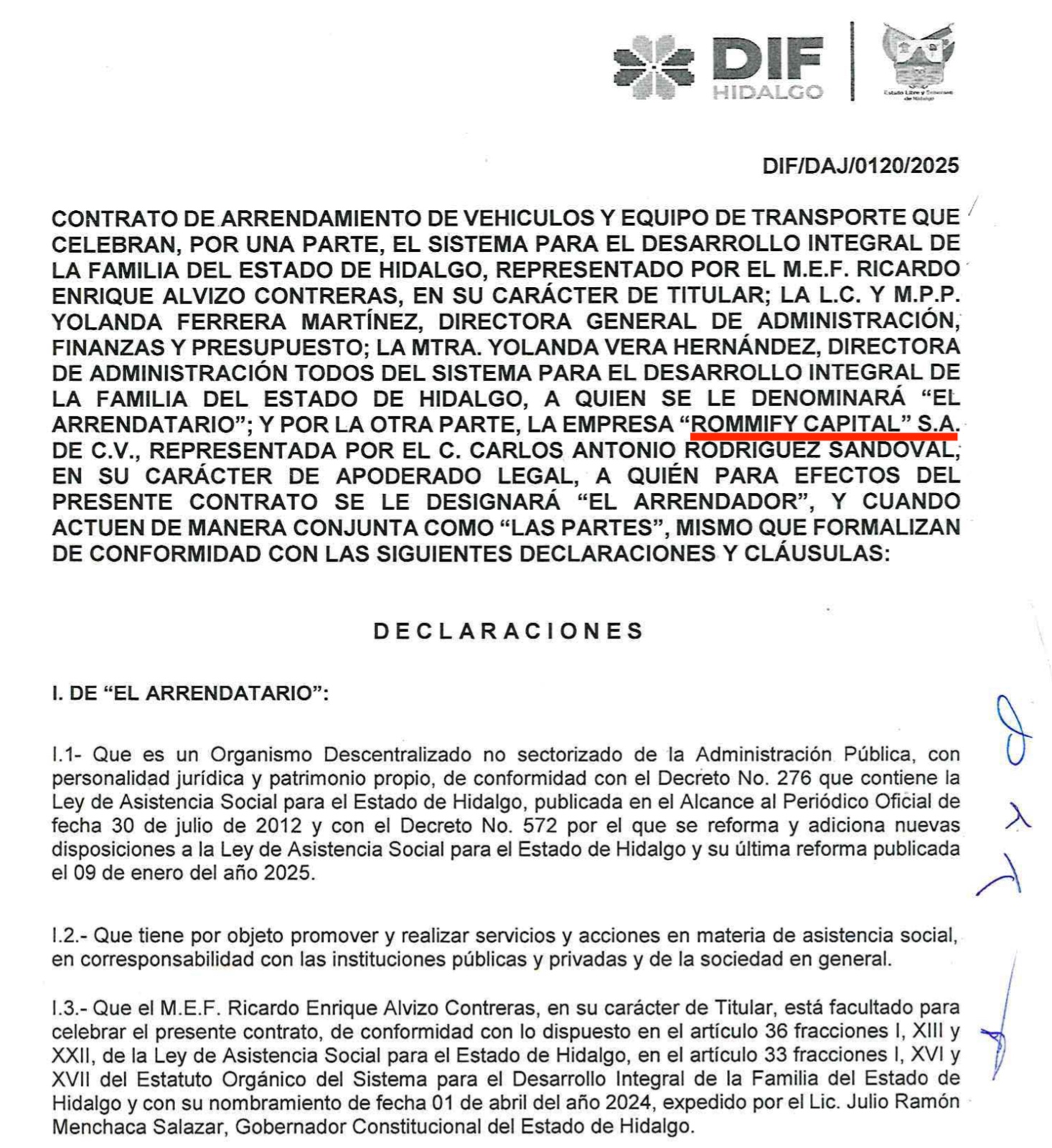 Recientemente firmó el contrato PMMR-SA-026-FORTAMUN-2025, 2 de julio de 2025, para el arrendamiento de patrullas en el municipio de Mineral de la Reforma por un monto de $13,777,737.60 pesos; en el DIF Estatal obtuvo el contrato DIF/DAJ/0120/2025, enero de 2025, para el arrendamiento de vehículos y equipo de transporte 2025-2026 por un monto de $26,352,339.78 pesos; el contrato 034/2025, del 7 de abril 2025, para el arrendamiento 58 camionetas pick up, modelo 2025, por un monto de $23,100,184.32 pesos; el contrato 033/2025, firmado el mismo 7 de abril para el arrendamiento de vehículos por un monto de $12,550,692.38 pesos.