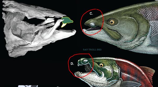 Como podemos ver en la imagen anterior, los salmones actuales por sí solos son bastante monstruosos, pero este ancestro va mucho más allá. El nombre oficial del nuevo pez es “Oncorhynchus rastrosus” y se cree que vivió hace 5 millones de años. Como mencionamos antes una de las cosas que más llamó la atención es el tamaño pues se cree que esté animal podía medir hasta 2.7 metros de largo. EL otro punto de interés es que tenía dos grandes colmillos al final de su boca, es por eso que le apodo “Salmón dientes de sable”, pero a diferencia del tigre con el mismo nombre, esté pez tenía los colmillos en horizontal.