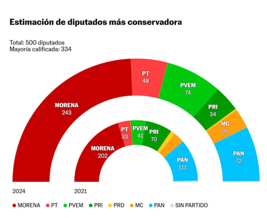 Pero ¿Cómo es que sucedió esto?, México utiliza un sistema mixto para la elección de diputados y senadores, combinando la representación proporcional y la mayoría relativa. En la Cámara de Diputados, 300 diputados son elegidos por mayoría relativa en distritos uninominales y 200 por representación proporcional en cinco circunscripciones plurinominales.